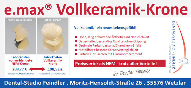 Keramik erfüllt höchste ästhetische Ansprüche und ist biologisch sehr verträglich. Vollkeramische Restaurationen haben keinen Metallkern. Deshalb kann das Licht wie bei natürlichen Zähnen hindurchscheinen und am Zahnfleischsaum zeigt sich kein dunkler Metallrand. Keramik ist farbbeständig und sehr abnutzungsfest. Zudem schont die geringe Wärmeleitfähigkeit den Zahnnerv, der auf Temperaturwechsel empfindsam reagiert.