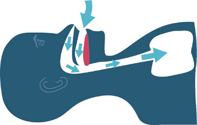 - Eine rückwärtige Unterkieferposition verursacht das Zurückfallen der Zunge (rot) in den Rachenraum und somit eine Verengung oder sogar den Verschluss der Atemwege.